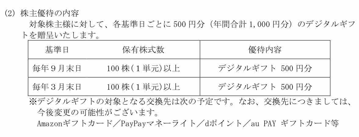 今回新設された株主優待は、100株以上でデジタルギフト500円分が年2回もらえます。初回は2026年9月末日です。