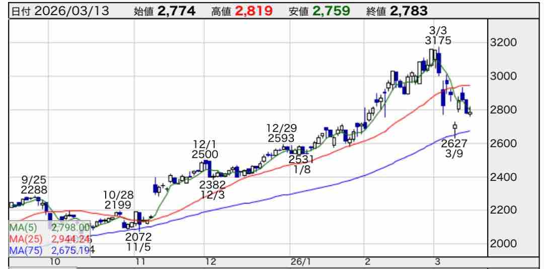 日足のチャートを見ると、3/3の高値3175円から1割ほど下落しています。