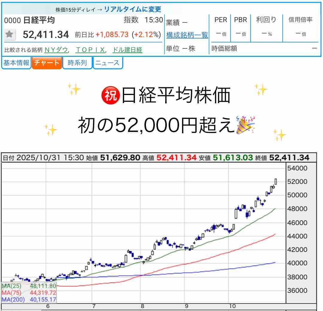 2025年10月31日の日経平均株価が史上初の52,000円を超えましたねー🎉🙌