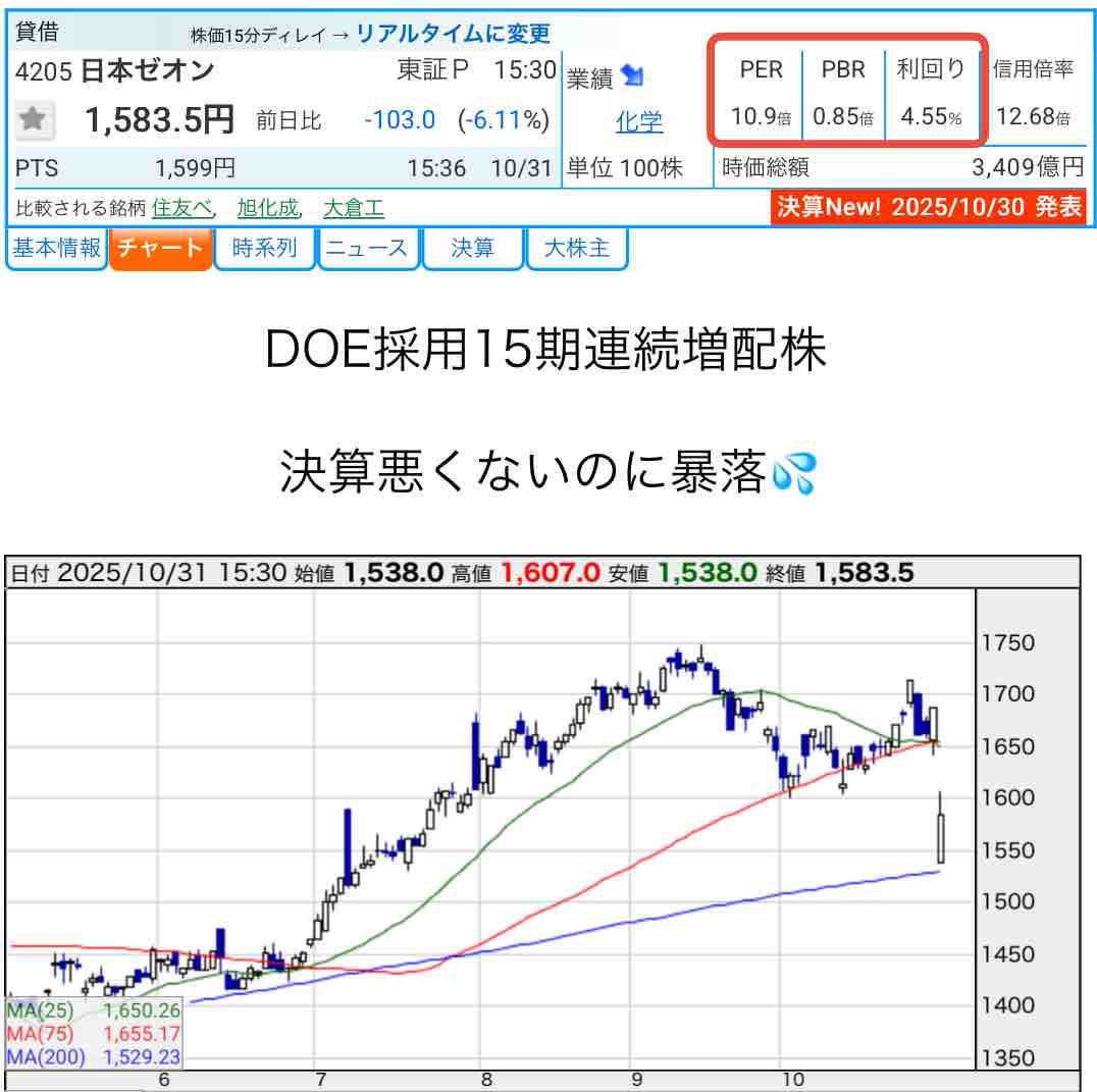 それが日本ゼオン、15期連続増配でDOE採用銘柄です。配当利回り4.5%以上で株価指標も割安だと思い、NISA口座で始値の100株購入しました。