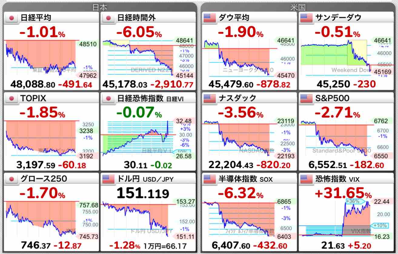 これにより米国市場も下落しています!半導体指数−6.32%で一番下落しています!VIX(恐怖指数)は+31.65%で22.44へ上昇しています‼️