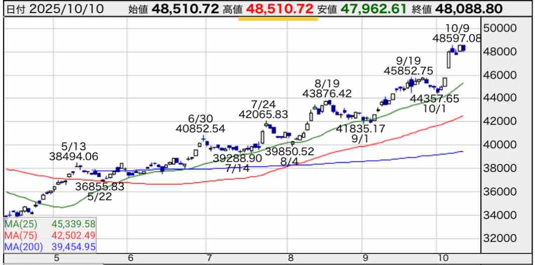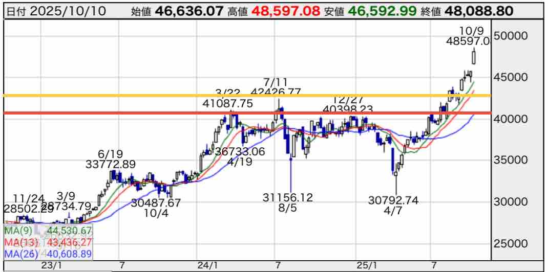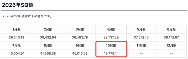 先週末のSQ値は48,779円でした!実際の日経平均株価の高値は48,510円でしたので、269円も乖離しました💦