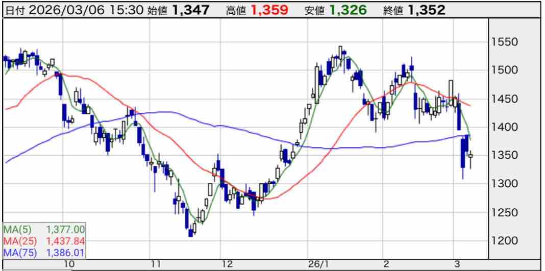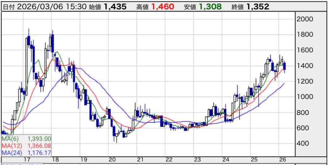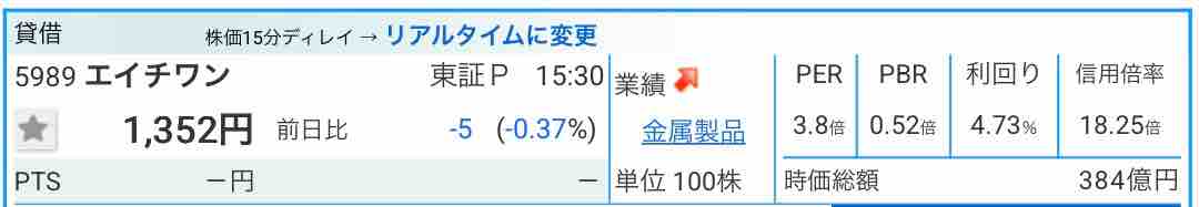 先週末の終値1352円、PBR0.52倍×PER3.8倍=ミックス係数1.976!みきまるさんが絶対に負けないというミックス係数2以下でした😳自動車部品銘柄ということで、自動車業界全体が低迷している煽りを受けているのでしょうか?🤔