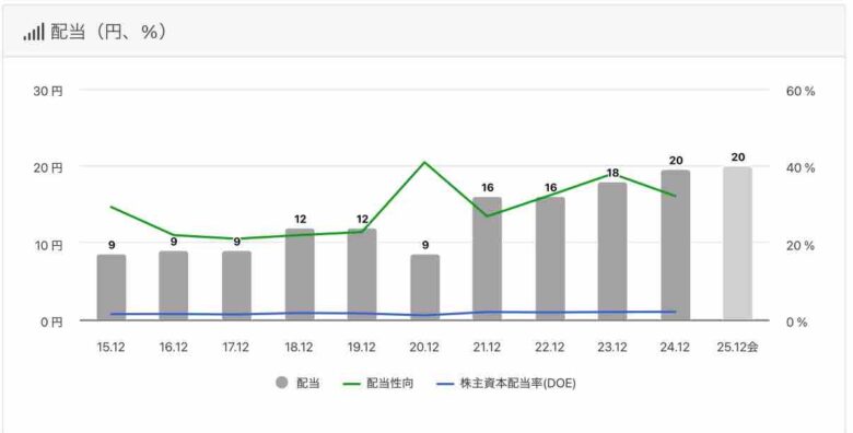 配当金の推移を見るとコロナ禍で一度減配がありましたが、その後は増配基調です。今期は1株配当20円を予定しています。