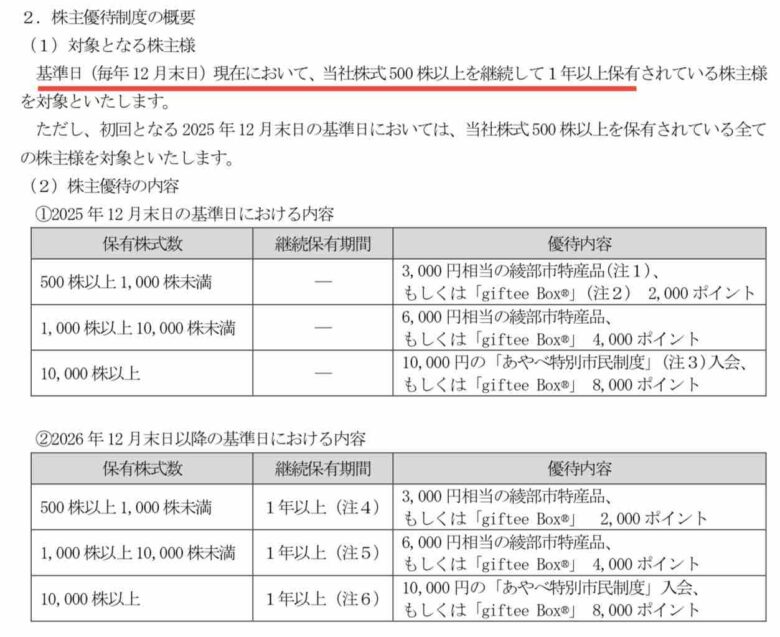 今回新設された株主優待は500株以上からですので少々ハードルが高いです💦500株以上で綾部市の特産品3000円相当orデジタルギフトがもらえます♪2025年12月末まで購入すれば初回のみ長期縛りがありません。しかし、来年以降は1年以上保有の条件が加わります😅