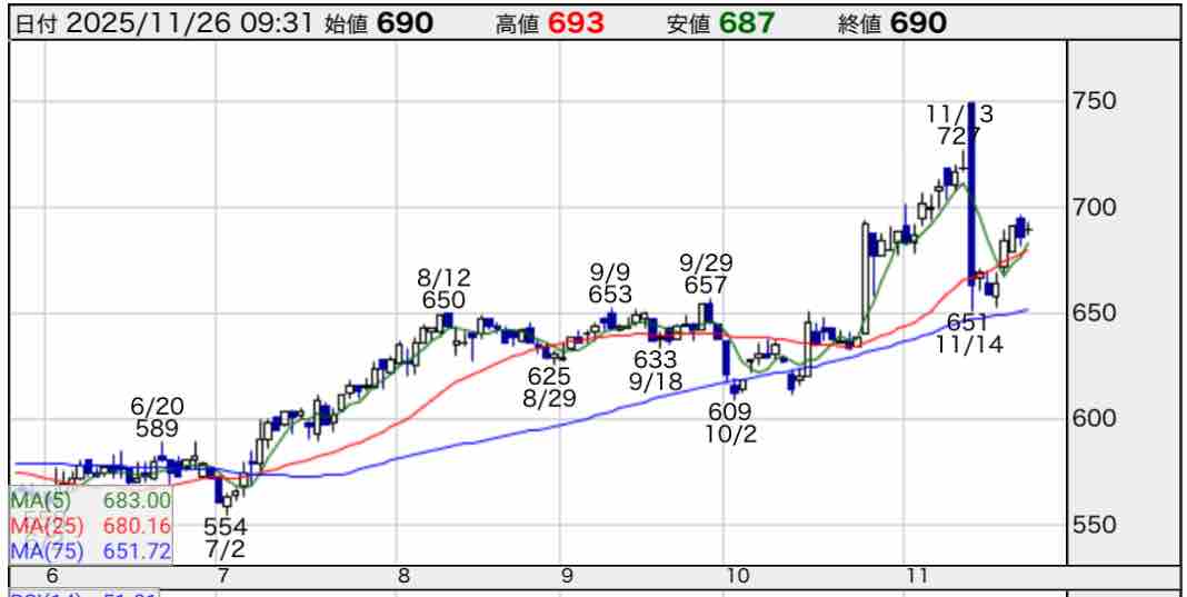 日足のチャートを見ると決算発表で株価が下落、株主優待の発表で少し回復しています。上昇トレンドは継続中です。100株以上から株主優待を設けていればもっと株価が上昇したでしょう😅