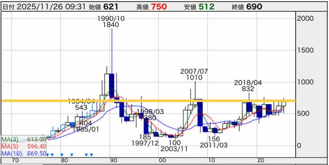 長期チャートで見ると現在株価690円は真ん中あたりでしょうか?2003年株価100円時代もあったんですね!チャートの形は大きなダブルボトム?に見えます。株価1000円を超えれば⤴️にいきそうです。