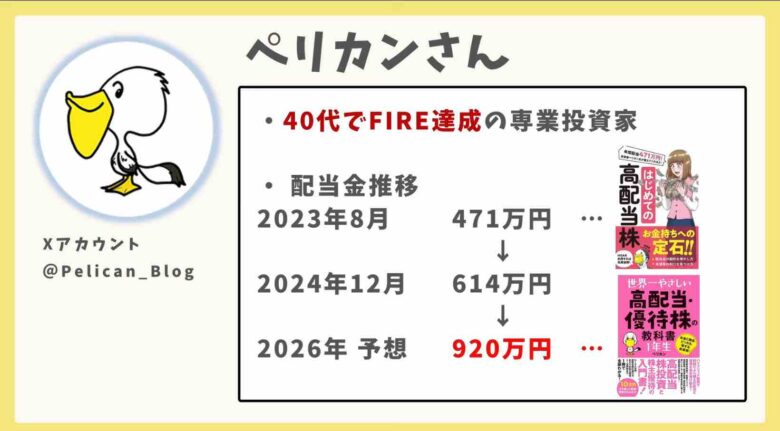 ペリカンさんとはXで仲良くして頂いてる高配当・株主優待投資家さんです。40代ですでにFIREしており、現在は専業投資家をしておられます。