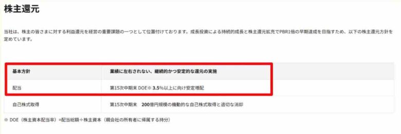 株主還元方針は、DOE3.5%に向け安定配当をうたっています。