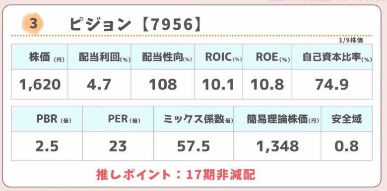 少子化により業績が苦しいピジョンですが、アジアの売上が上がって来ています。ROIC、ROEともに2桁もあり稼ぐ力を持っています。有利子負債はほぼなく、自己資本比率は70%超えの財務健全企業です。