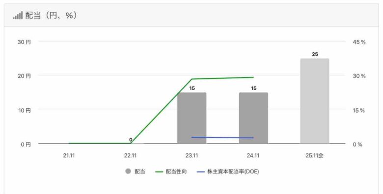 上場来、配当金を出してくれており、今期は10円増配の1株25円を予定しています。株価834円とすると、配当利回りは3%です。