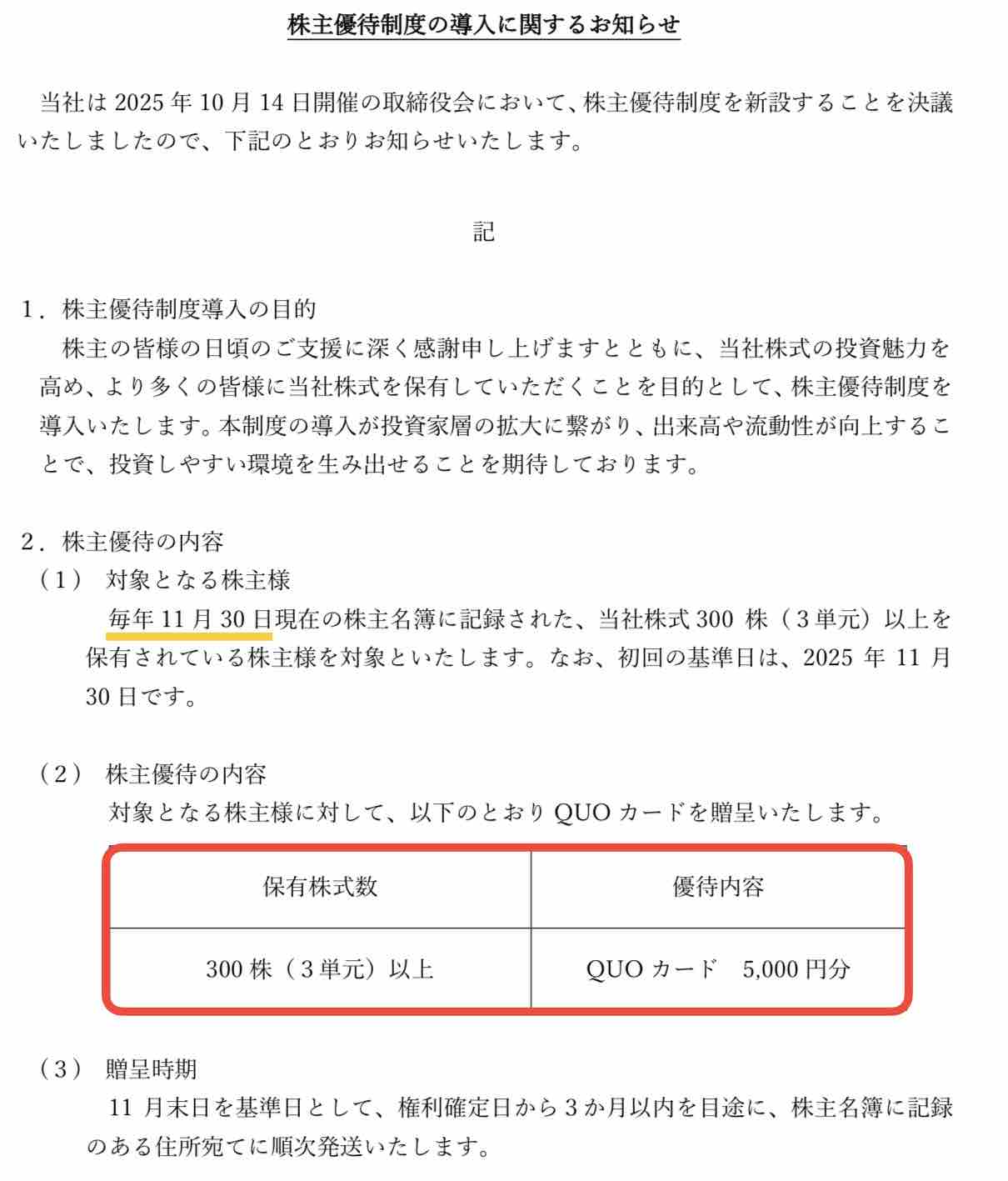 今回新設された株主優待はQUOカード❣️300株以上で5000円分がもらえます♪権利日は11月末です。