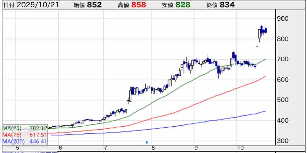 日足のチャートを見ると、株主優待の発表でストップ高をした後高止まりしています。