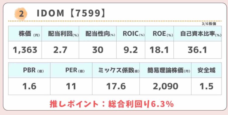 IDOMは、中古車販売のガリバーを運営する企業です。株価指標は割安ではありませんが稼ぐ力のROEが18%もあります。