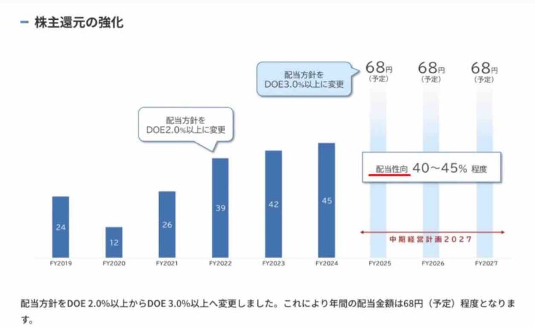 中期経営計画ではDOE2%→3%へ株主還元を強化しています。