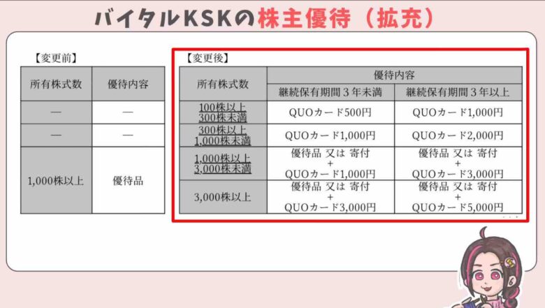 以前は1000株以上からの株主優待でしたが、今回拡充され100株以上からQUOカードなどがもらえるようになりました。