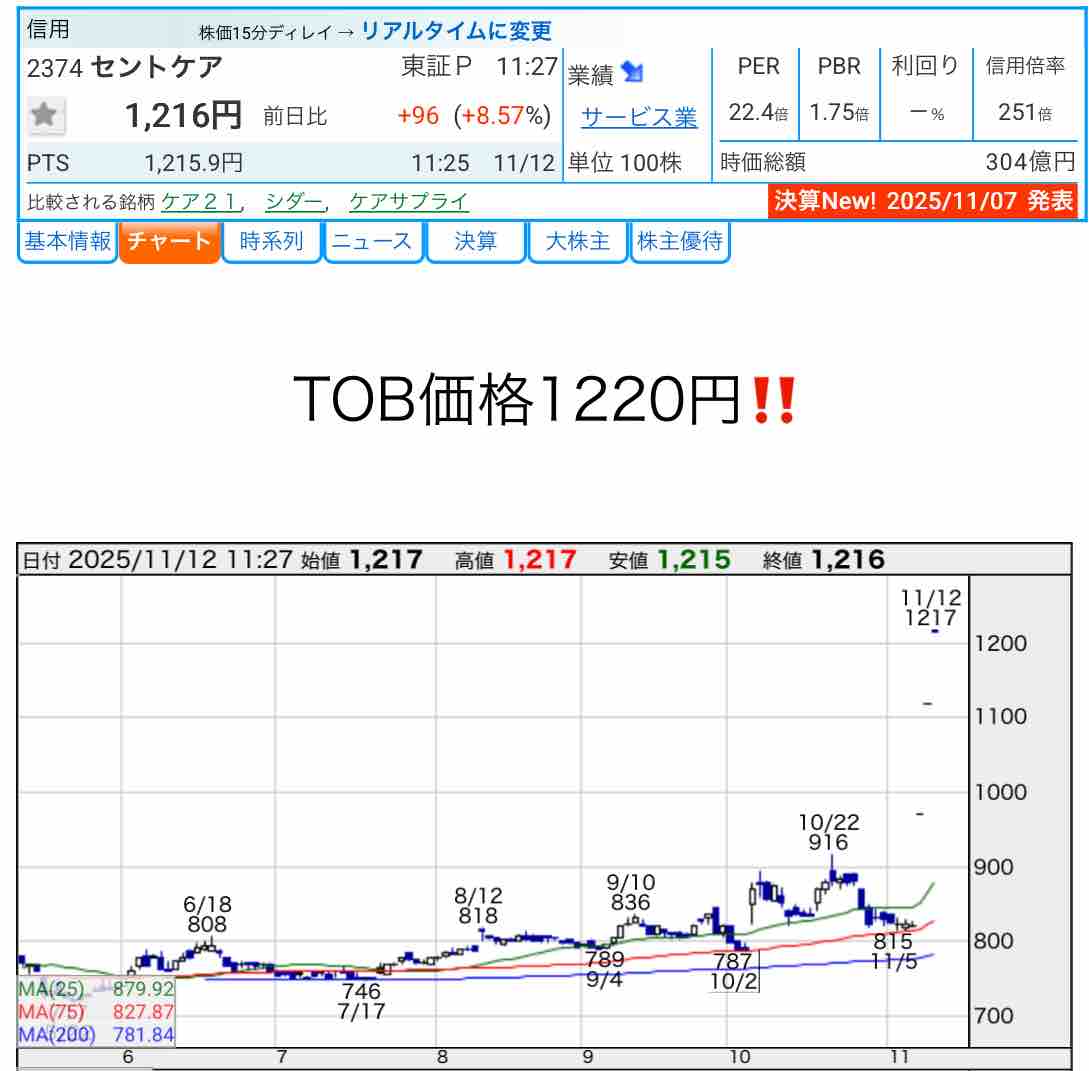 先週末、訪問介護の【2374】セントケアHDがTOBを発表しました🎉