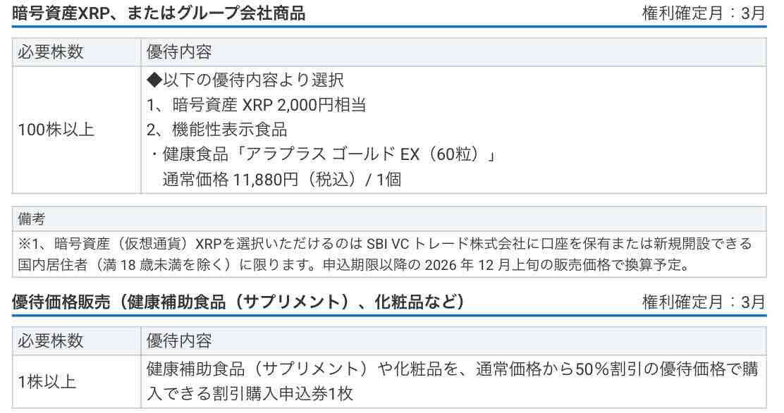 今回新設された株主優待は、100株以上で暗号資産XRP2000円分とサプリメント(11880円相当)のどちらかがもらえます。