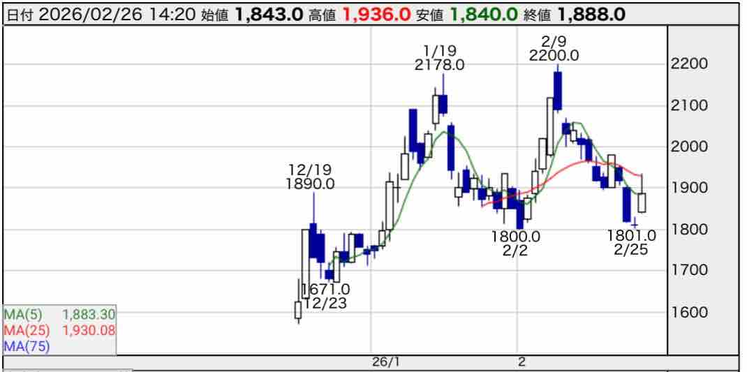 まだ上場したばかりで短いチャートしかありません💦 ダブルトップの形が見受けられ、ネックラインの1800円を下回ると下落トレンドとなりそうです😅
