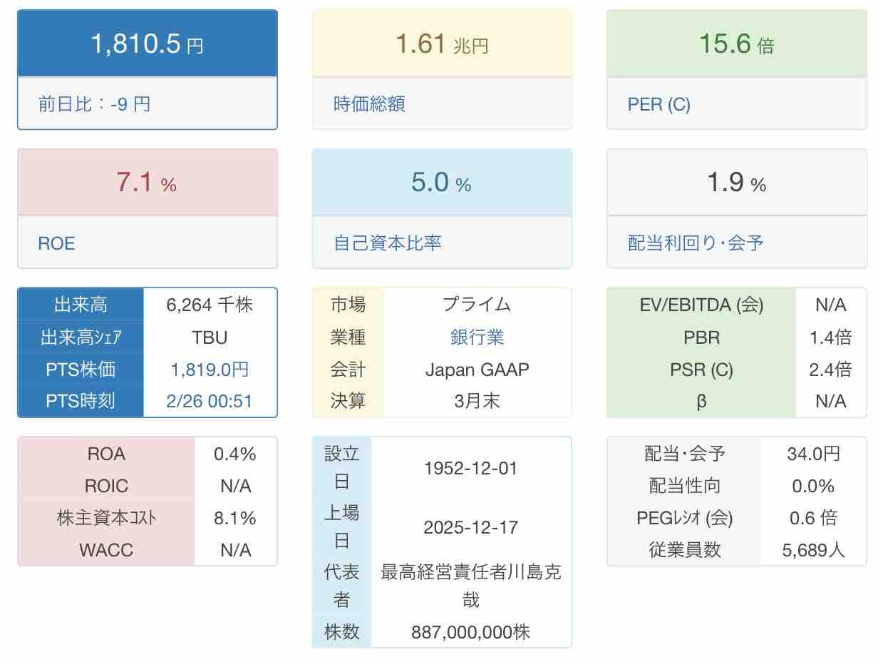 銀行業にしてはPBRが高めです。PBR1.4倍×PER15.6倍=ミックス係数21.8倍なので、株価指標は割安水準とは言えません。