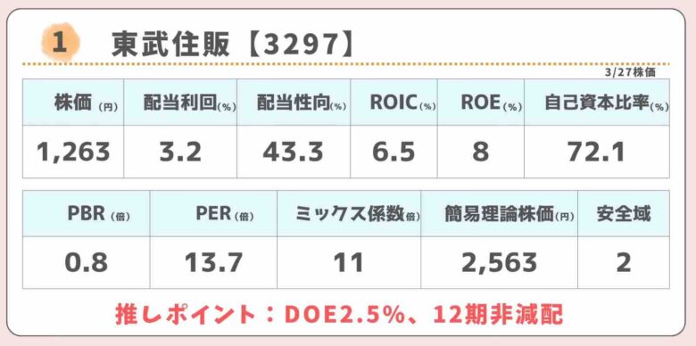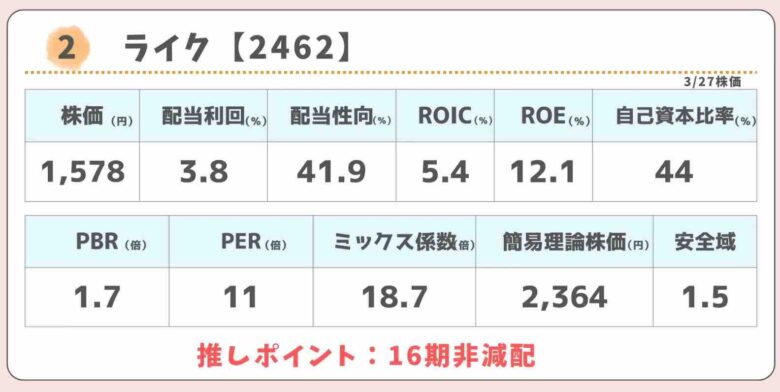 株価指標は若干割安水準で、自己資本比率が72%もある財務健全企業です。配当政策はDOE2.5%、12期非減配です。