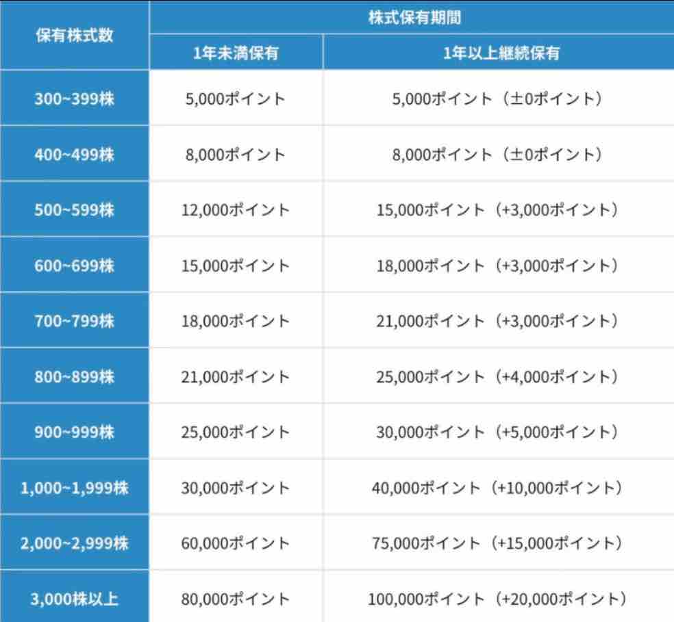 株主優待はプレミアム優待倶楽部ポイントです。300株以上からもらえ、500株以上からは長期保有特典でポイントがプラスされます。