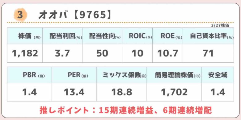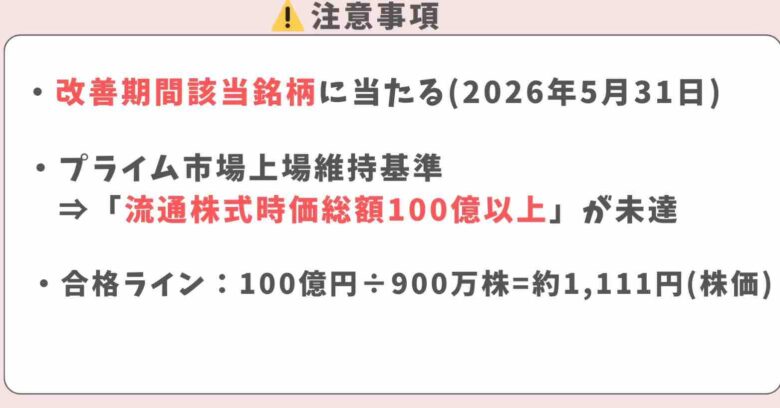 注意事項としてオオバは改善期間該当銘柄に当たっております。一応、株価は合格水準ですし、プライム市場からスタンダード市場へ移行すれば良いのでは?と思っています。