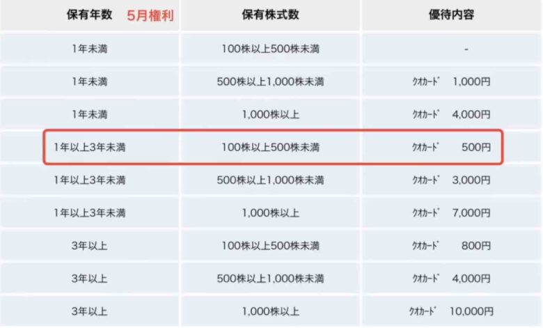 株主優待は100株以上〜500株未満ではQUOカード500円分がもらえますが、1年以上の条件が付きます。500株以上からは長期縛りがありません。