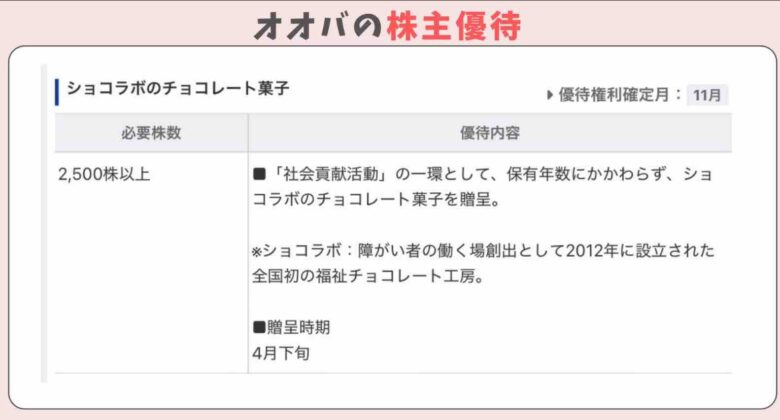 2500株以上保有の株主には11月にショコラボのチョコレートがもらえるそうです。