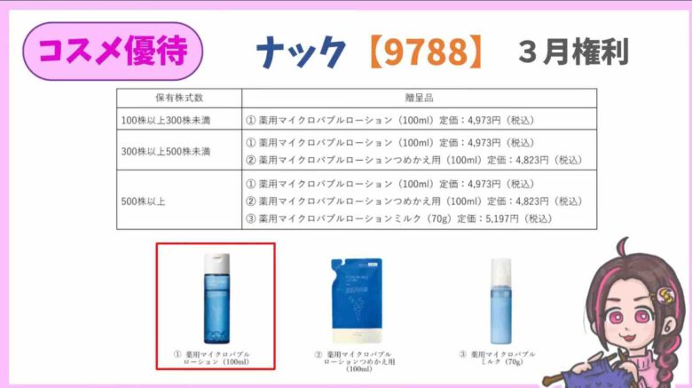 優待内容は薬用マイクロバブルローション¥4973です。5万円くらいで買えて、配当利回り4%もあります。総合利回りは13%くらいです♪