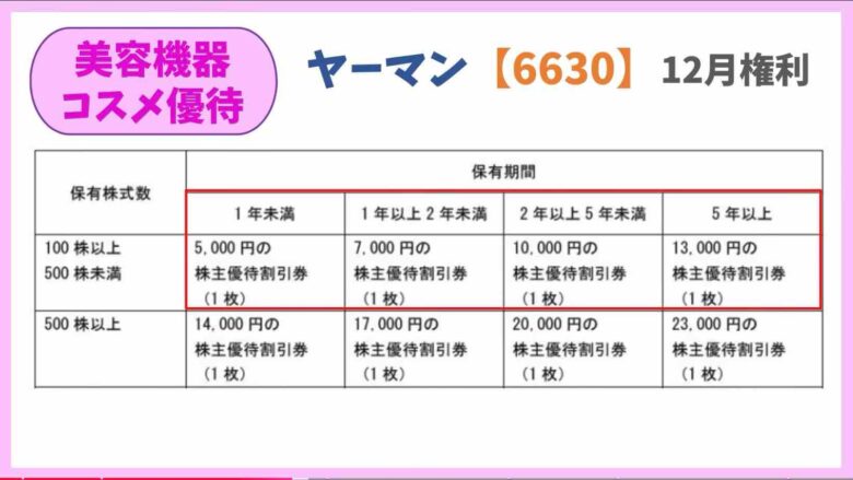 美容機器でお馴染みヤーマンは100株以上で5000円分の優待割引券がもらえます。長期保有特典がお得になっており、5年以上保有すると13000円分の割引券がもらえます。
