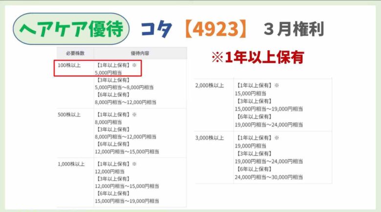 100株3年未満保有で人気のヘアオイル、エルジュータ¥3388がもらえます。上場来非減配を継続しています。