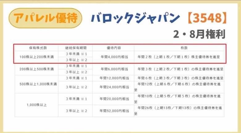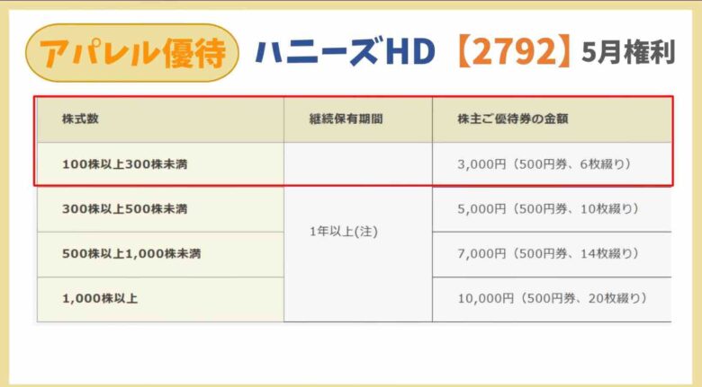 100株1年以上保有で3000円分の自社割引券がもらえます。