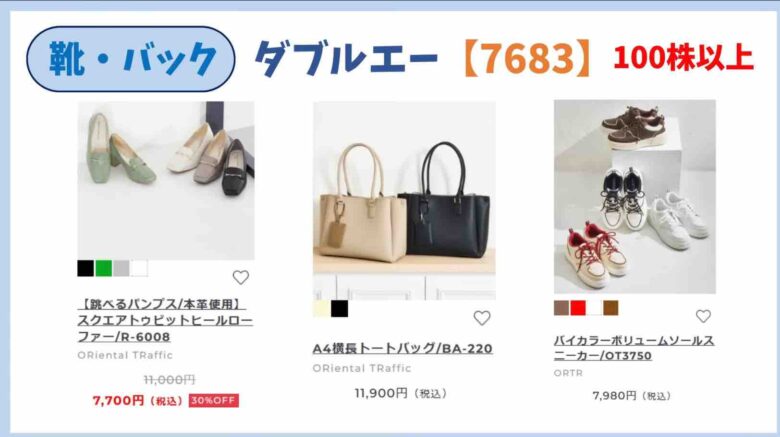 100株以上で8000円相当の自社製品の靴やバックが年2回もらえます。最近、メンズスニーカーも優待品に加わりました。600株以上で4万円までのブランド靴がもらえます。妹ちゃんは卑弥呼の靴が欲しいそうです。