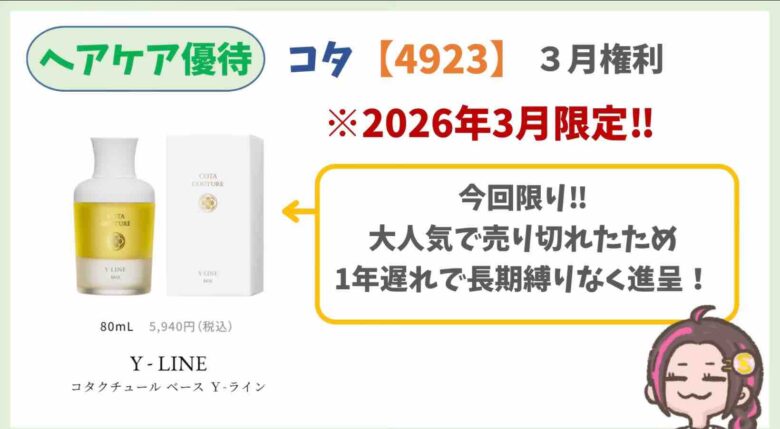 100株3年未満保有で人気のヘアオイル、エルジュータ¥3388がもらえます。上場来非減配を継続しています。