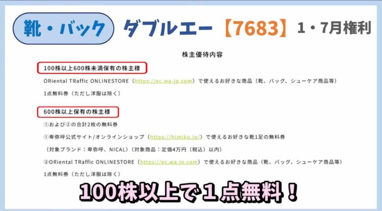 100株以上で8000円相当の自社製品の靴やバックが年2回もらえます。最近、メンズスニーカーも優待品に加わりました。600株以上で4万円までのブランド靴がもらえます。妹ちゃんは卑弥呼の靴が欲しいそうです。