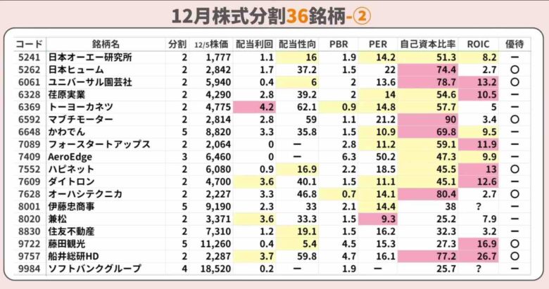 12月の分割銘柄は36銘柄もありますが、すでに株価が高くなってしまい買い向かうには勇気が要りますね!そこで、株価指標の一覧表を作成しました!(割安な水準の値には黄色やピンクで色付けしてあります)