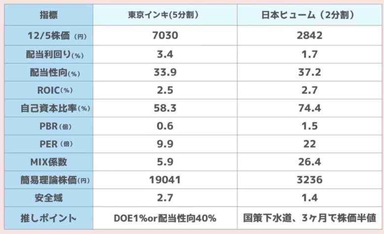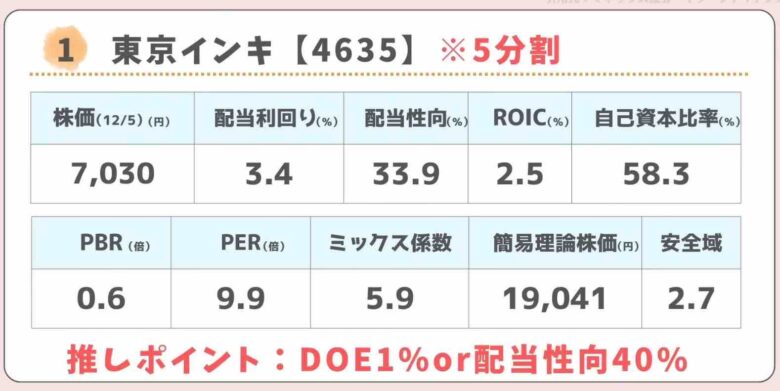 ミックス係数もヘムさん式簡易理論株価も相当割安水準です。7月頃4000円台だった株価があれよあれよと言う間に7000円台まで上昇していました😅 5分割するので、来年以降株価1400円くらいで購入したいと思っています。