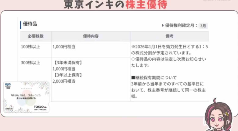 現在の株主優待は100株以上でQUOカード1000円分です。分割後の優待の発表はまだありません。