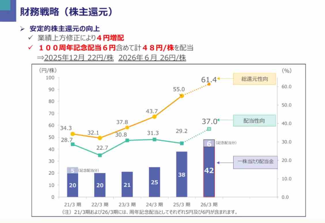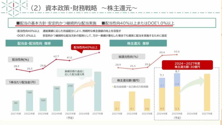 中期経営計画では配当性向40%以上又はDOE1%をうたっています。
