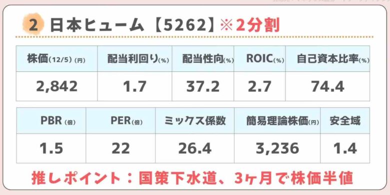 株価指標を見るとまだ割高です💦株価5000円超えは高すぎましたね。でも、国策下水道関連銘柄ですので、分割後の押し目は拾いたいと思います。