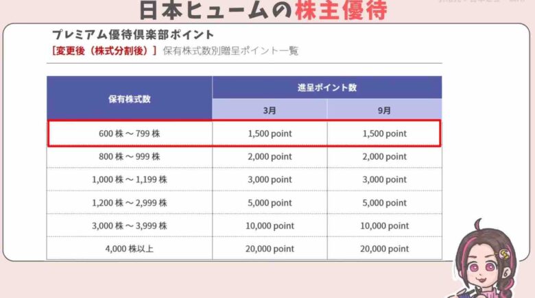 株主優待はプレミアム優待倶楽部ポイントです。分割後の優待が発表されており、従来より拡充されています。