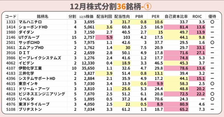 12月の分割銘柄は36銘柄もありますが、すでに株価が高くなってしまい買い向かうには勇気が要りますね!そこで、株価指標の一覧表を作成しました!(割安な水準の値には黄色やピンクで色付けしてあります)