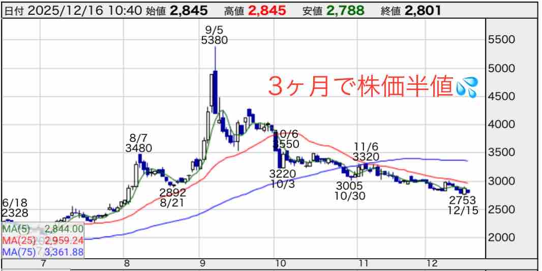 なぜ日本ヒュームを狙っているのか?と言いますと、直近3ヶ月で株価が半値になっているからです。12月末で2分割するというのにすでに2分割されている感じです🤭