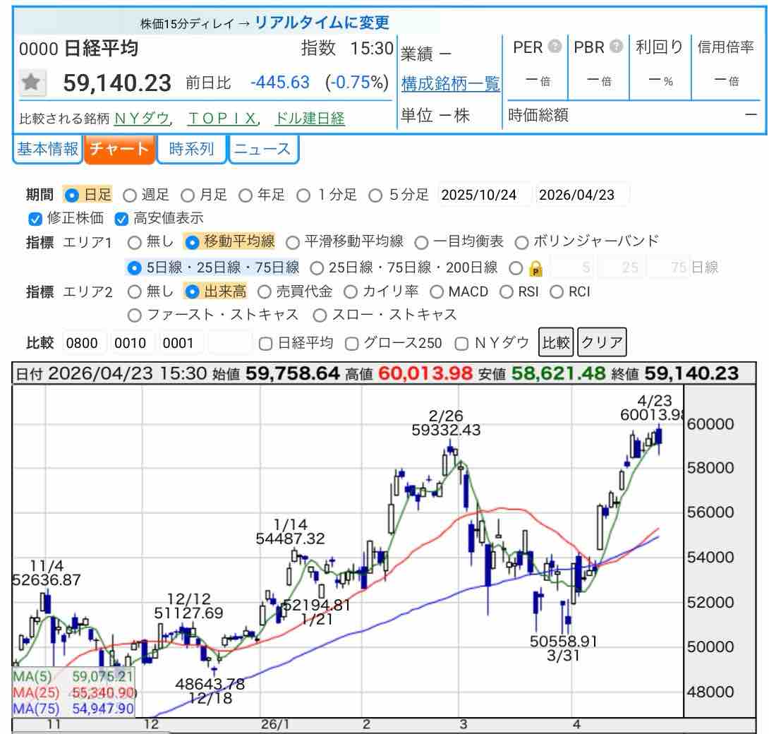 2026年4月23日、日経平均株価は一時6万円の大台に達しました🎉🎉🎉歴史的瞬間なのですが、保有株はどんどん下がっていて実感が湧きませんが…😅