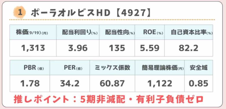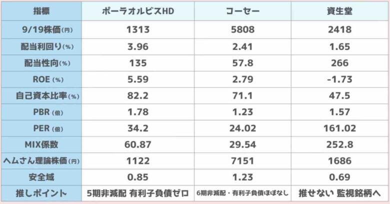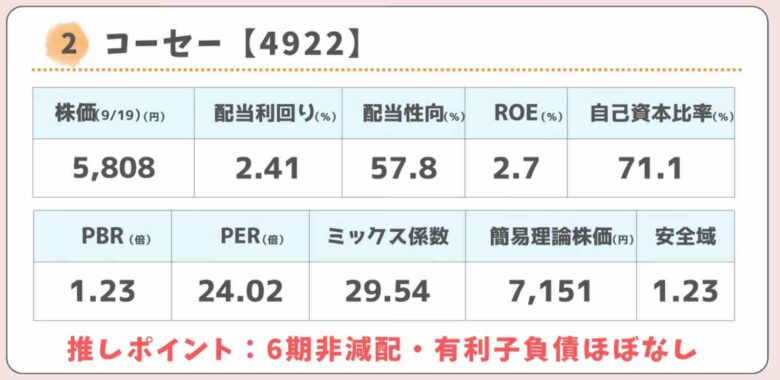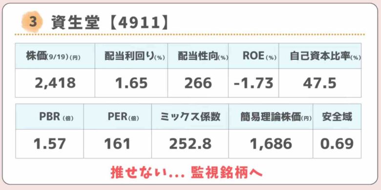 人気の資生堂ですが、昨年は固定資産の売却や1500人をリストラしたりして経費の削減に注力しました。第一四半期決算は赤字転落で厳しい状況が続いています。株価指標は割高で、紹介しておきながら推せません💦😅
