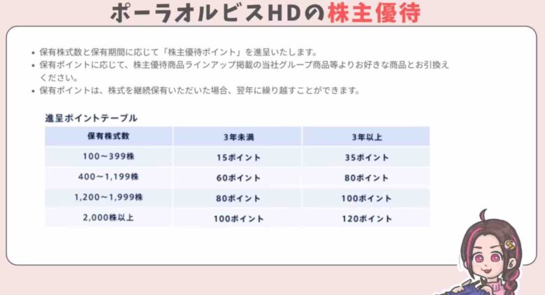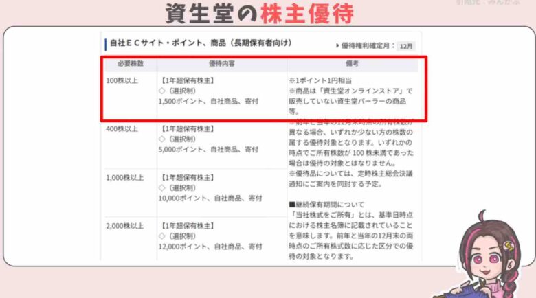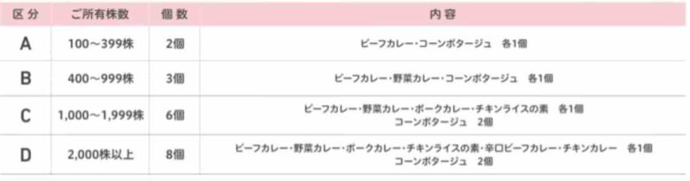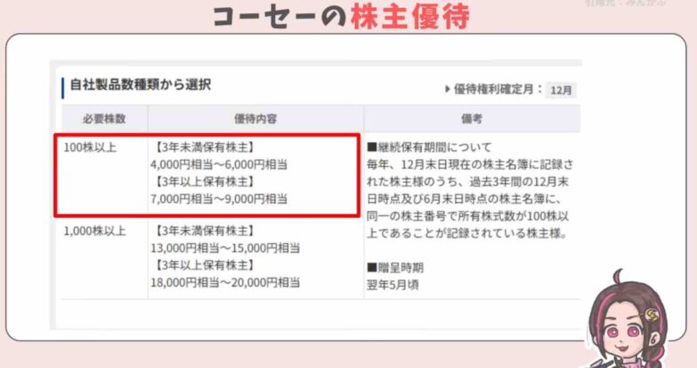 株主優待は12月権利で、100株以上で4000〜6000円相当の自社製品がもらえます。さらに3年以上保有すれば、7000〜9000円相当にグレードアップされます。