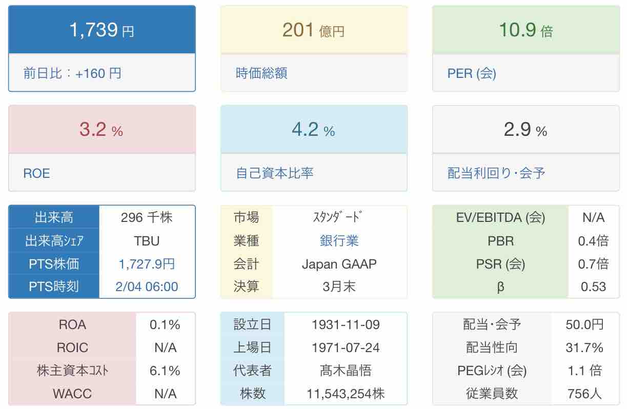 時価総額201億円の小さな地銀です。PBR0.4倍×PER10.6倍=ミックス係数4.24‼️株価指標は超割安です。