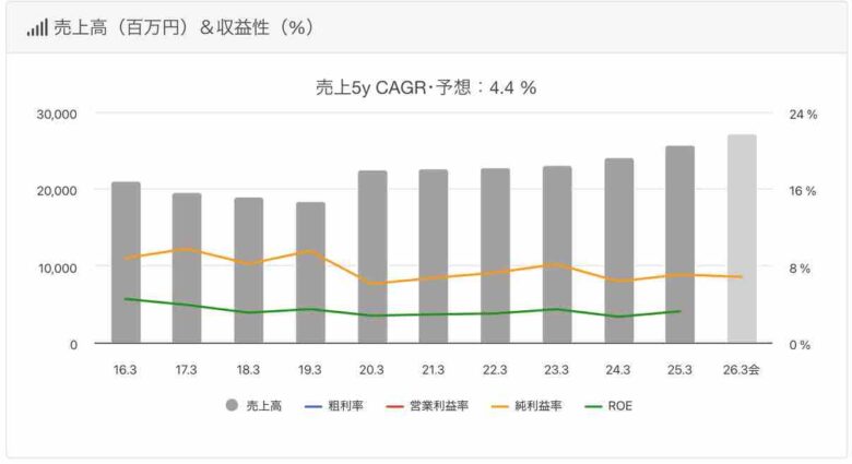 26年3月期第3四半期累計(4-12月)の連結経常利益は前年同期比18.9%増の22.8億円に伸び、通期計画の26.5億円に対する進捗率は86.2%に達し、5年平均の82.2%も上回った。