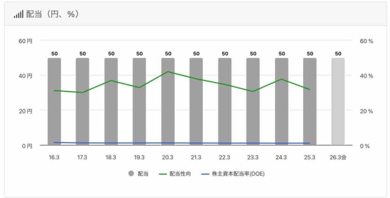 配当金はずっと1株50円を維持しています。2031年に設立100周年を迎えるので、記念配当などがあるかもしれませんね!